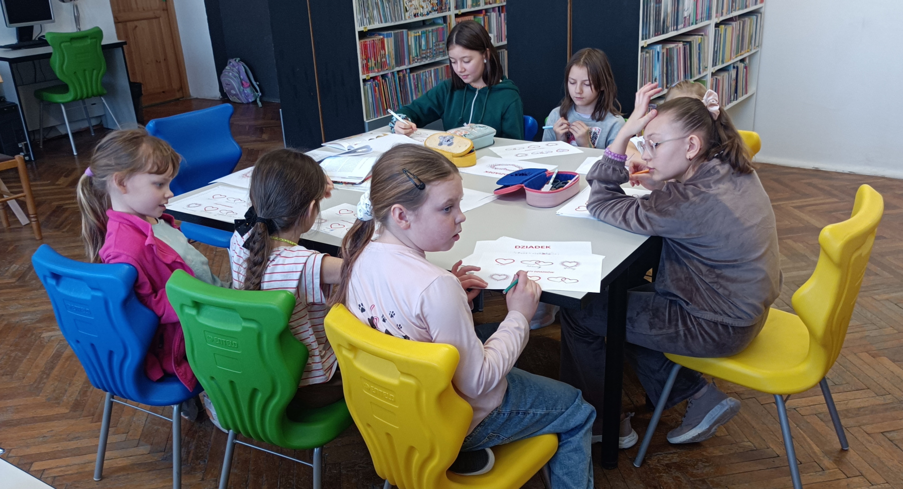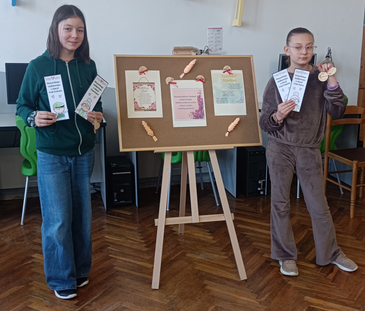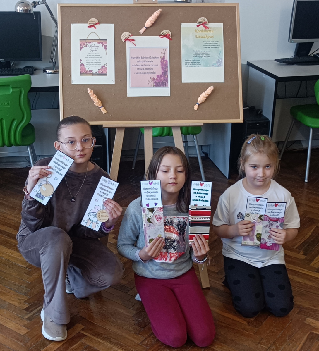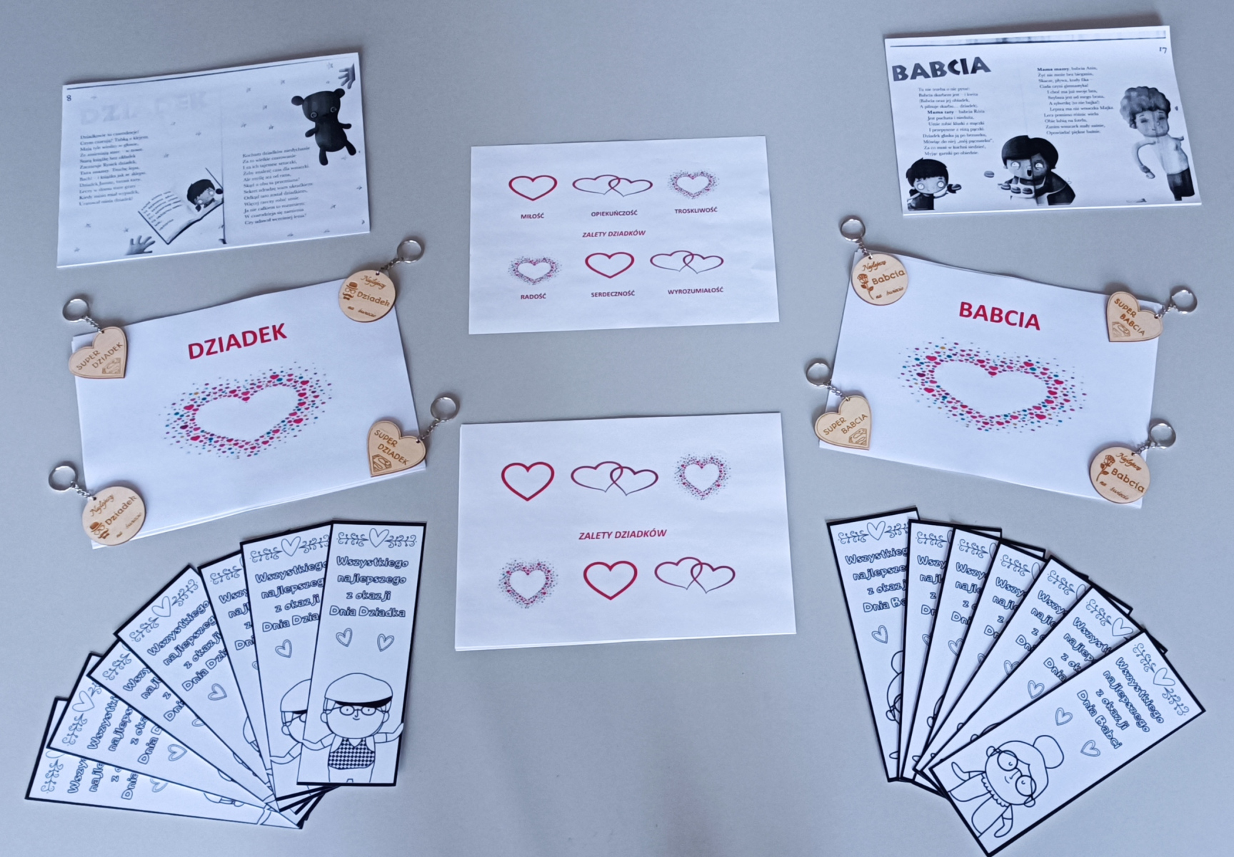 Z okazji Dnia Babci i Dnia Dziadka uczniowie wykonywali zakładki. Na zakończenie spotkania otrzymali od nauczyciela bibliotekarza upominki dla swoich dziadków drewniane breloczki.